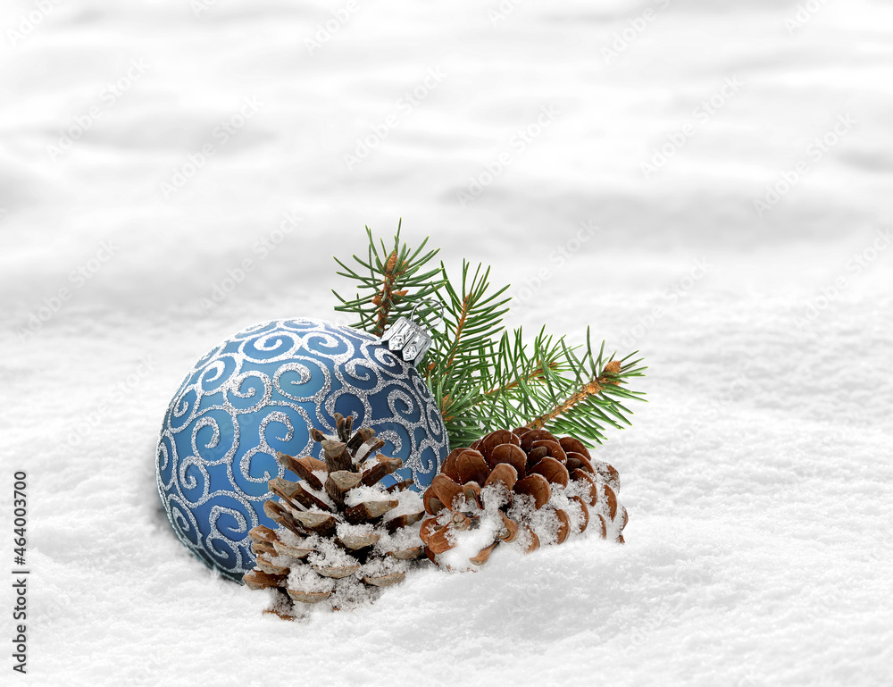 Blue christmas ball, pine cones and fir branch on snow. Winter background