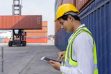 Engineer or foreman holding tablet and looking down to checking inventory or job details with cargo container background. Engineering site and working with technology concept.
