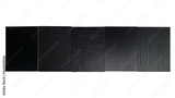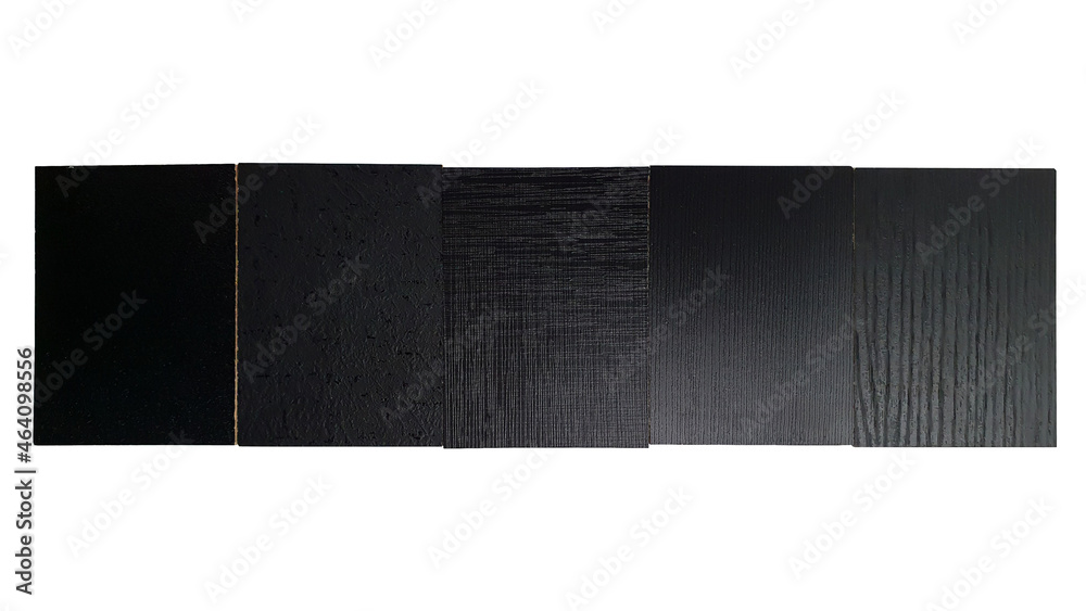 multi surface of melamine samples contains wooden, fabric, stone, pearl textures in black color, isolated on white background with clipping path. palette showing various texture of melamine samples.