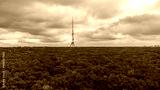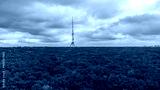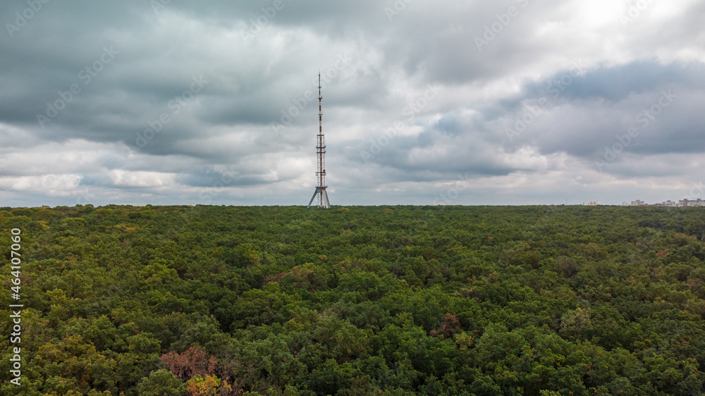 Aerial view green dark forest with telecommunication tower antenna and cloudy gray epic sky. Kharkiv, Ukraine