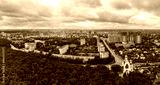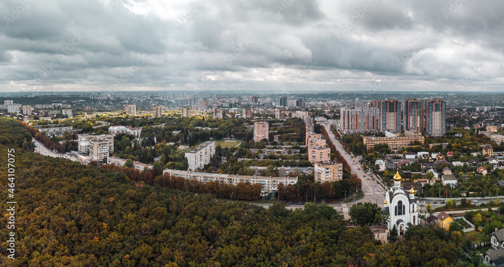 Cityscape aerial panorama with dramatic clouds. Kharkiv city Pavlovo Pole district, view on Nauky ave, church and multistory high residential buildings from autumn forest