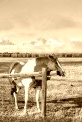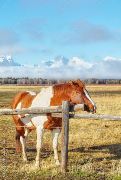 Horse by pasture fence with Teton Range in background, Wyoming, USA.