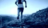 Active mountain trail runner dressed bright t-shirt with backpack running endurance marathon race by picturesque hills at sunset time back view photo. Sporty active people backlight concept image.