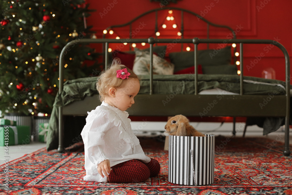 Cute toddler girl in dress sits on the floor and looking at a Christmas gift box with a rabbit in it
