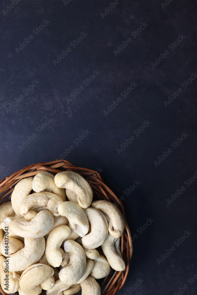 Tasty Cashew nuts in a mini wooden basket on the back background. Goan Kaju. Copy space. Dry fruits background or festivals banners. Diwali gift concept.
