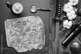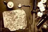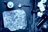 Samurai sword and ancient map on the old flat lay table concept background.