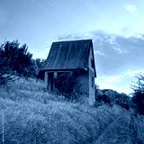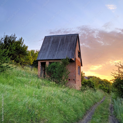 A dilapidated abandoned rural house overgrown with grass near the road at sunset