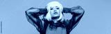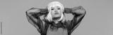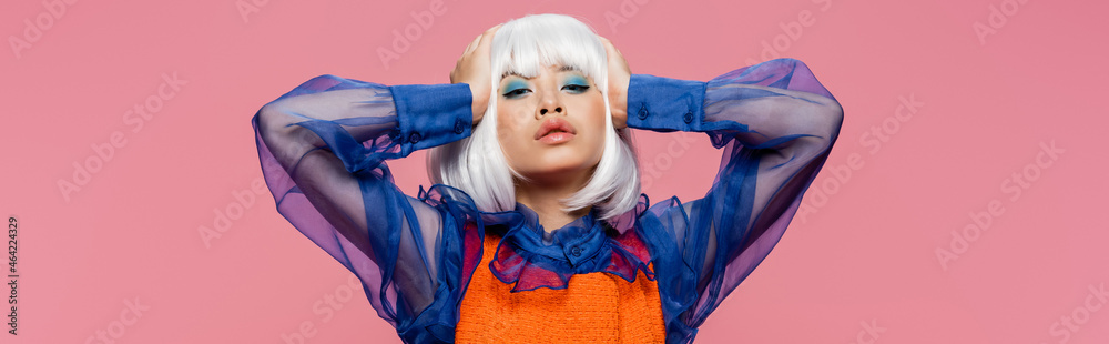Asian pop art woman in vintage clothes touching head isolated on pink, banner