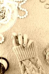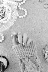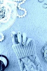 Womans hand with trendy lavender manicure. Fashion clothes and accessories
