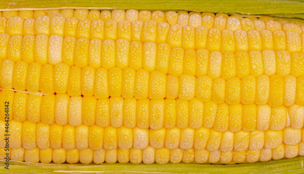 close up The corn kernels are lined up in a row of corn kernels. Fresh golden yellow cobs boiled corn.