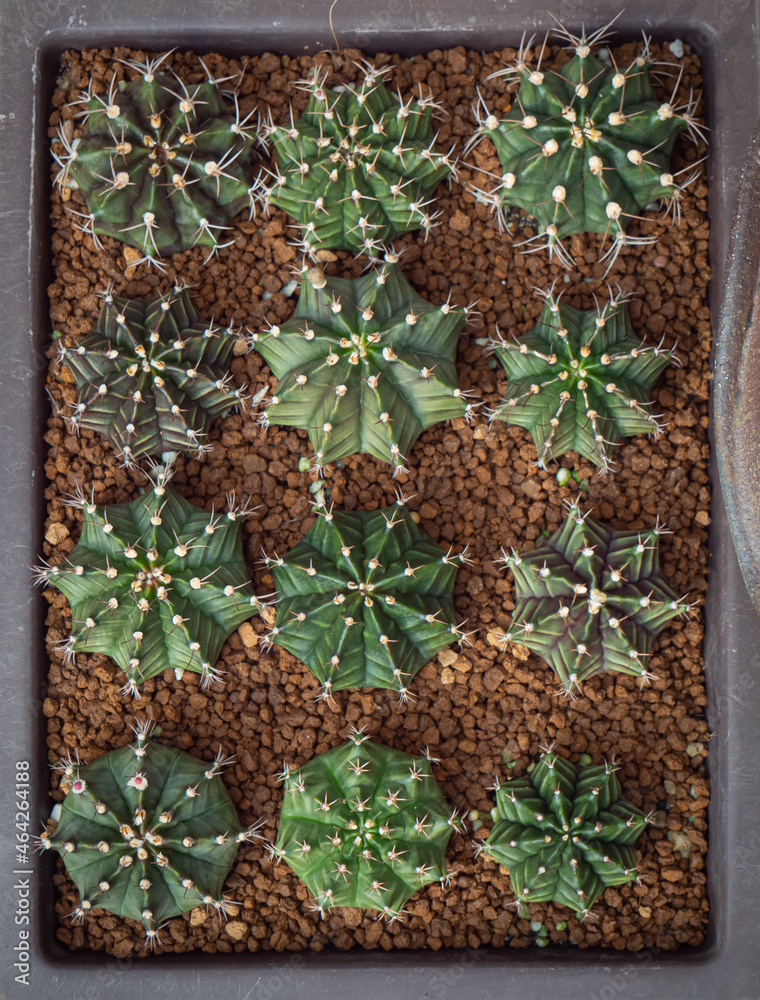 Top view photo. Potted cactus, several varieties of Gymnocalicium. Combined plant pot. Sprinkle the pot with small pebbles.