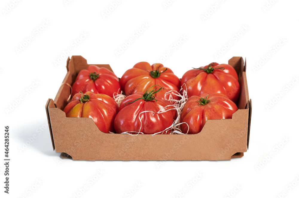Fresh tomatoes in recyclable cardboard box isolated from white background