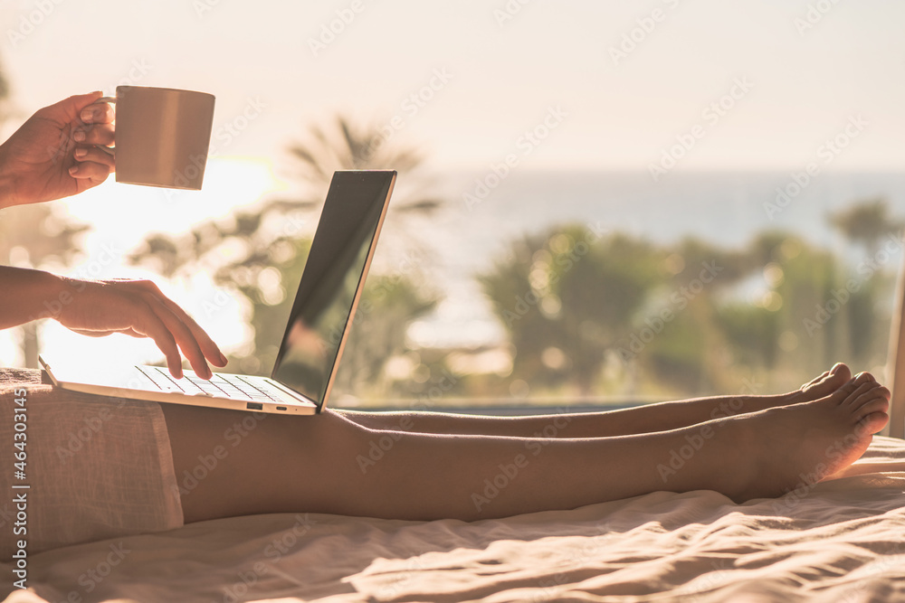 Woman freelancer working with laptop holding cup of coffee sitting on the bed in bedroom near panoramic window with view on palm tree sea beach at sunrise