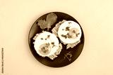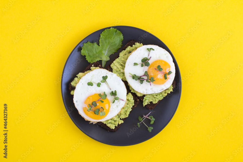 Top view of avocado toasts for breakfast with rye bread, avocado puree, fried eggs and microgreen on the yellow background