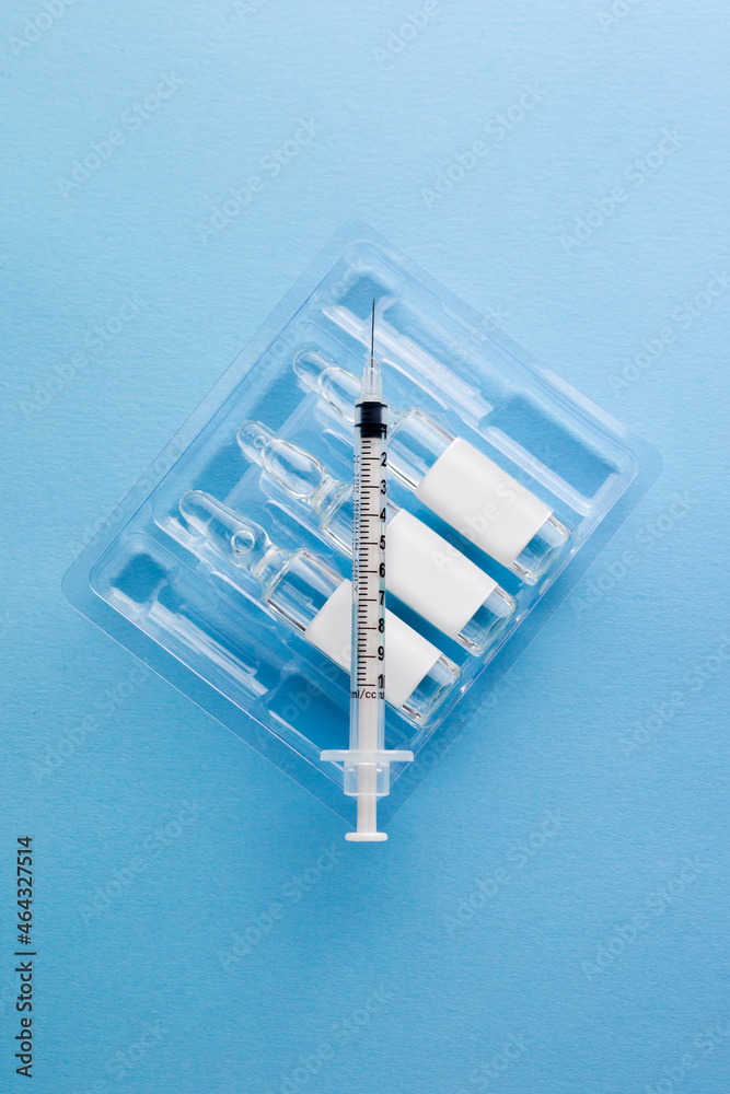 Vaccine with syringe and pills.Vaccine with syringe on a blue background.Vaccine with syringe isolated with place for text.Syringe with ampoule with copy space. Medicine.Treatment.Drugs.means.Vitamins