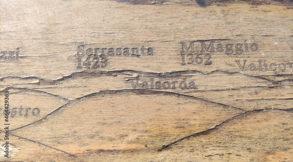 Vecchia tavola di legno incisa con le indicazioni altezza monti