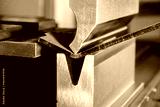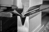 Work on a CNC bending machine in a factory. Sheet metal bending on a high-precision sheet metal bending machine.