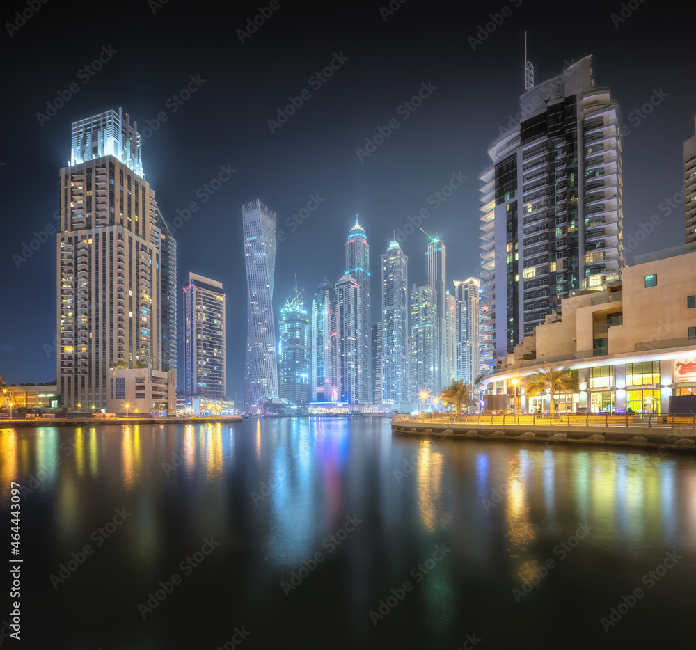 Night time panoramic view of Dubai Marina bay and city center, UAE