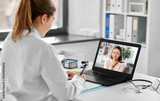 healthcare, technology and medicine concept - female doctor having video call with sick woman patient on laptop computer at hospital