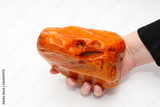 Big brilliant amber piece in hand on a white background. Unique natural semi-precious material for jewelers. Geology and minerals. Sunny stone. Crystal. Fossil ancient resin. Copal