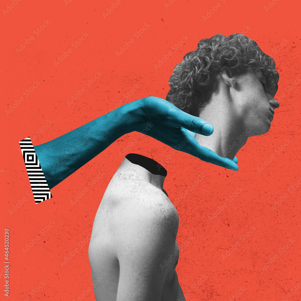 Modern design, contemporary art collage. Inspiration, idea, trendy urban magazine style. Male head and hand on dark red background