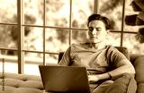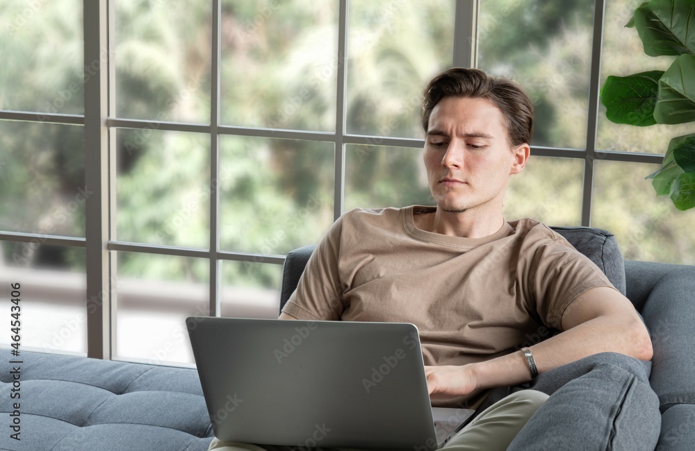 A good looking young man sits comfortably on a long sofa or laptop or notebook. A young man sits at work like working from home or accessing social media.