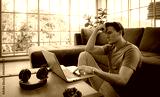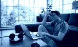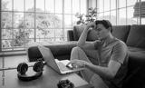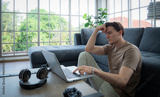 A good-looking young man sitting on a laptop or notebook with a worried, worried and bored expression on his face . A young man sits and works in a work-from-home manner or accesses social media.