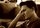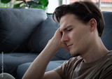 Close up handsome young man Anxious, worried, and bored expression. A young man sits and works in a work-from-home manner, but becomes bored and worried, possibly due to depression.