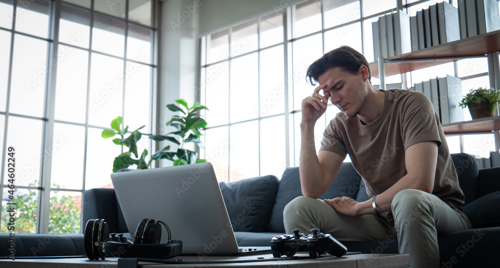 A good-looking young man sitting on a laptop or notebook with a worried, worried and bored expression on his face . A young man sits and works in a work-from-home manner or accesses social media.