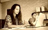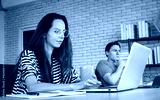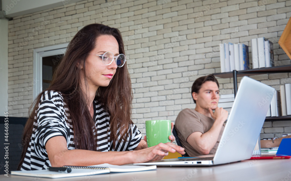 Home office or work from home concept. Young women, teenagers, sitting and working with laptop or notebook on the desk at home or office.