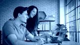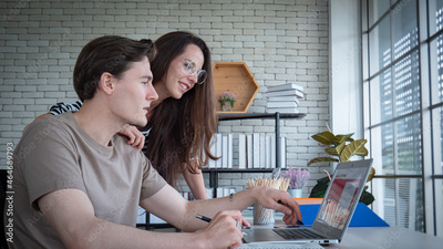 Home office or work from home concept. Young man and woman caucasian white sitting and working with laptop or notebook on the desk at home or office.