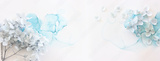 Creative image of pastel blue Hydrangea flowers on artistic ink background. Top view with copy space