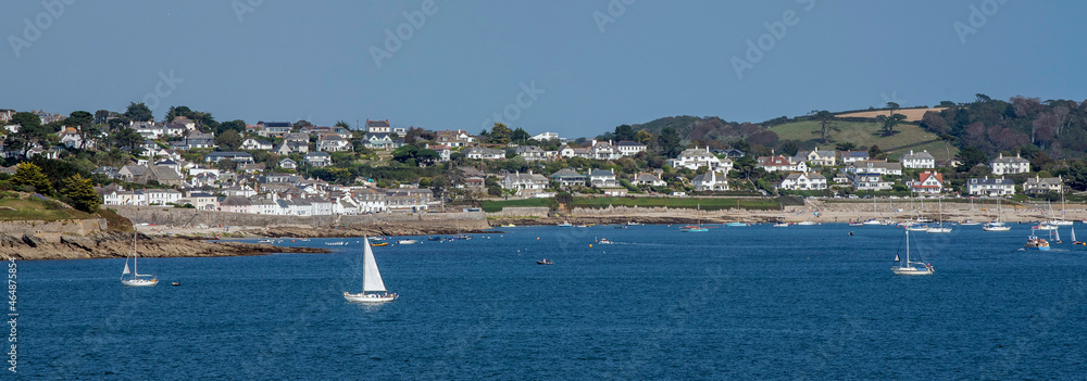 St. Mawes, Cornwall, England, UK. 2021. A view of St Mawes a popular Cornish holiday resort across the Carrick Roads, Falmouth, Cornwall, UK