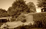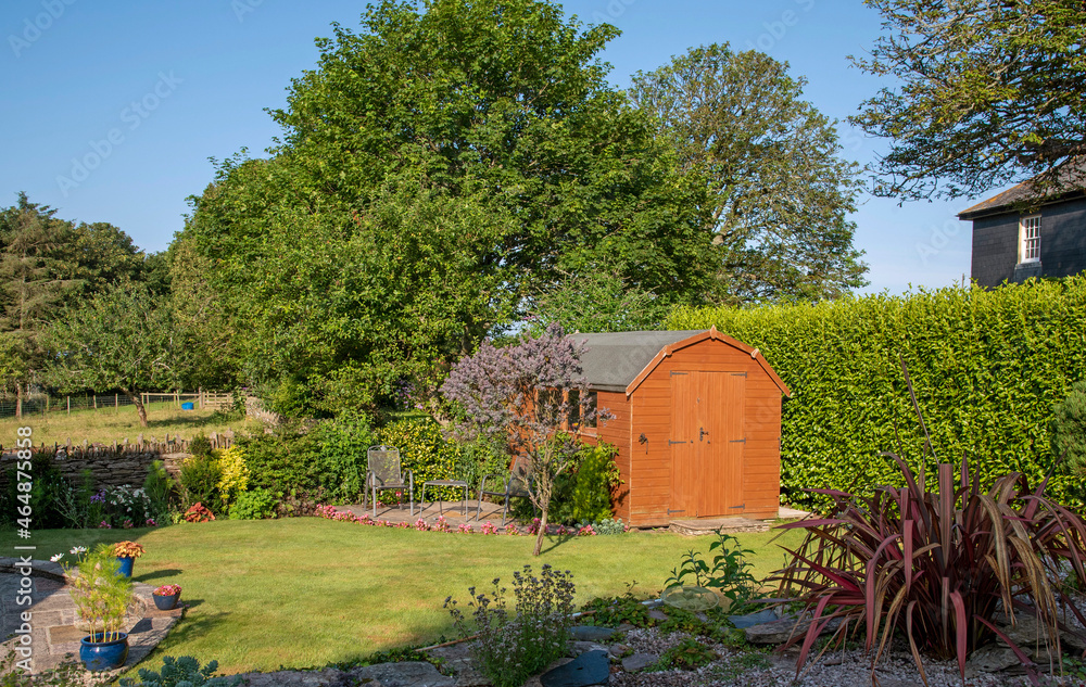 Devon, England, UK. 2021. A Dutch barn style garden shed with double doors standing with patio, tables and chairs in an English country garden.