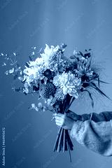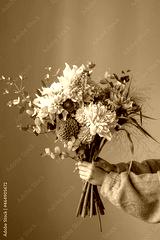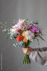 A woman is holding a festive bouquet with chrysathemum flowers in her hands.