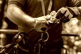 manos de una persona con una polea de soporte y equipo de seguridad para cables de canopy en Costa Rica