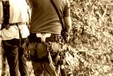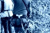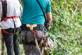 Hombre en una plataforma en los arboles de la selva en Costa rica con herramientas de seguridad para canopy
