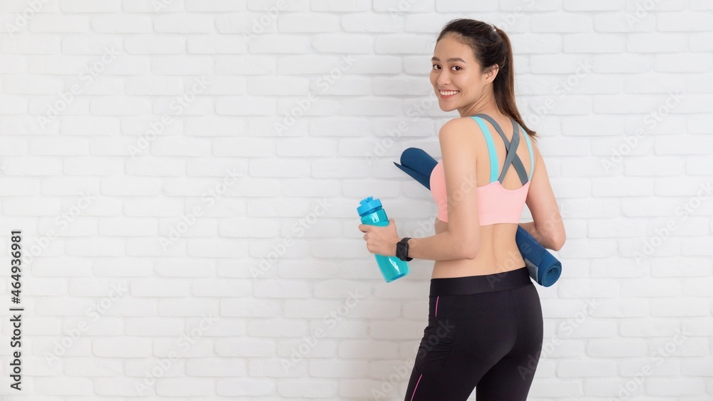 Asian beautiful women holding water bottle after play yoga and exercise on white brick wall background with copy space.Exercise for Lose weight, increase flexibility and tighten the shape.