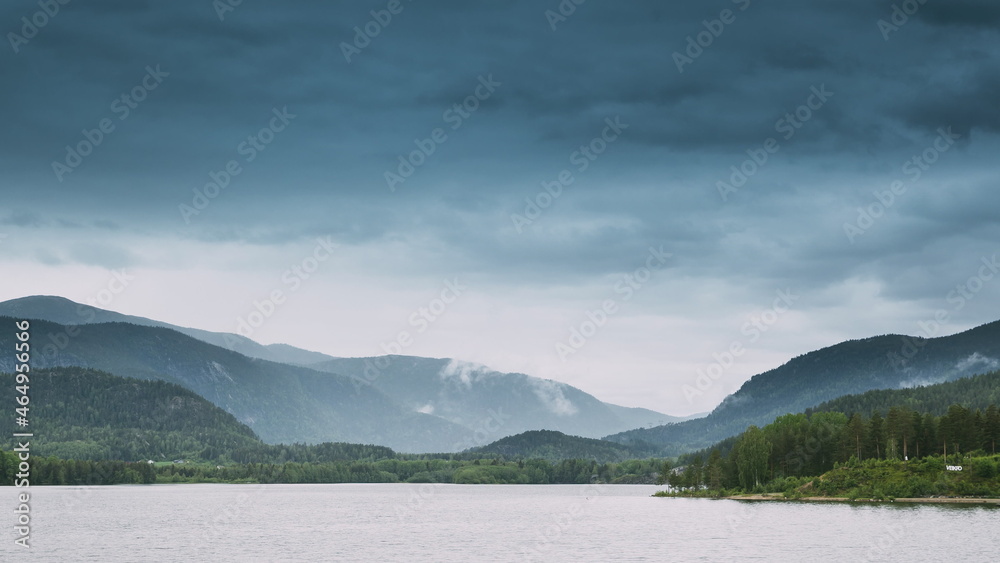 Norway. Beautiful Lake Kroderen In Summer Cloudy Day. Norwegian Nature. Kroderfjorden In Municipality Of Krodsherad In Buskerud, Norway.