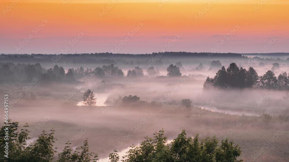 Amazing Sunrise Over Misty Landscape. Scenic View Of Foggy Morning Sky With Rising Sun Above Misty Forest And River. Early Summer Nature Of Eastern Europe. 4K