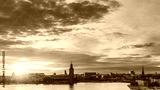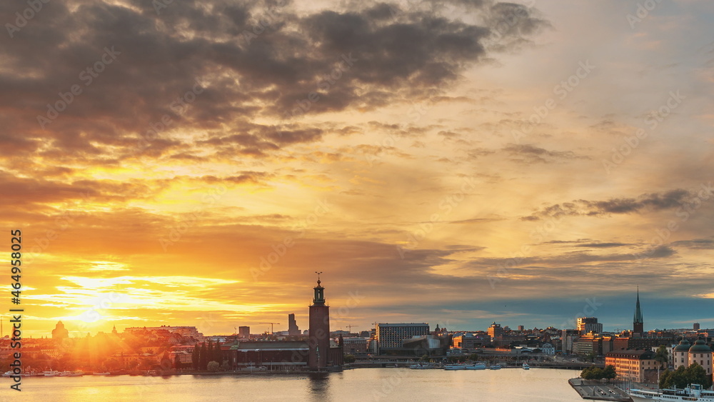 Stockholm, Sweden. Skyline Cityscape Famous View Of Old Town Gamla Stan In Summer Evening. Famous Popular Destination Scenic UNESCO World Heritage Site. Popular City Hall, Riddarholm Church In Sunset.