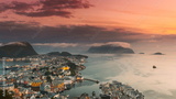 Alesund, Norway. Day To Night Time-lapse. Dramatic Sky In Warm Colours Above Alesunds Islands In Sunset Time. 4K. Famous Town In Evening Night Time