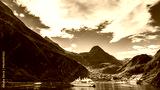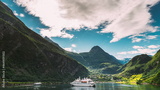 Geirangerfjord, Norway. Touristic Ship Ferry Boat Cruise Ship Liner Floating Near Geiranger In Geirangerfjorden In Summer Day. Famous Norwegian Landmark And Popular Destination. 4K
