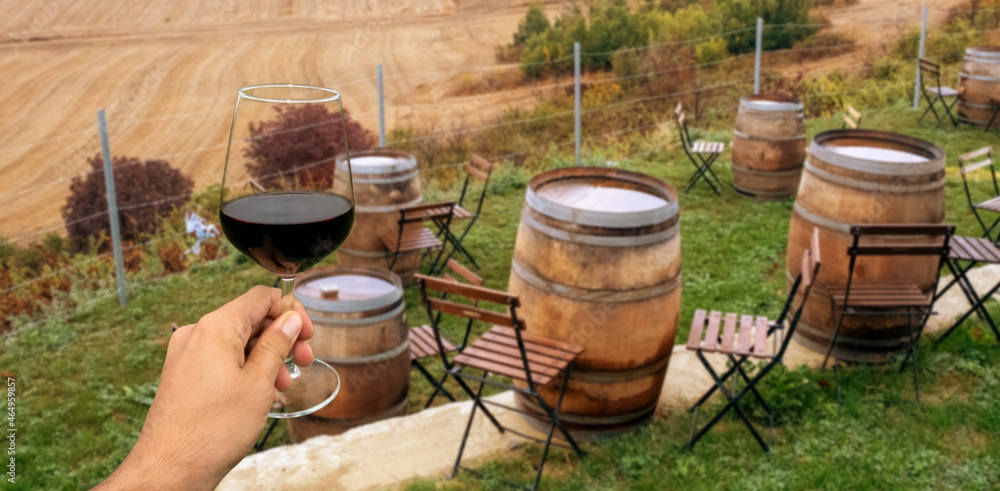 hand holding wine glass in vineyard