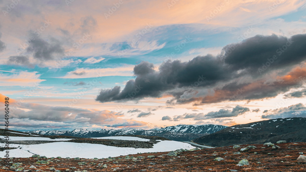 Aurlandsfjellet, Norway. Summer Norwegian Scenic Landscape Near Aurlandsfjellet Road. Scenic Route Road In Summer Sunny Evening. Popular Destination During Sunset