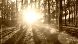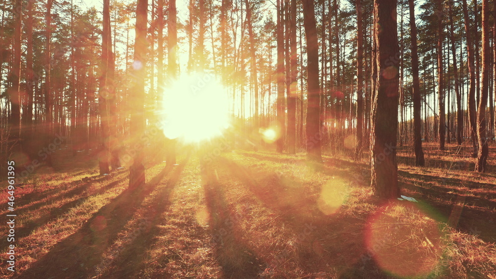 Beautiful Sunrise Sun Sunshine In Sunny Spring Coniferous Forest. Sunlight Sunbeams Through Woods In Forest Landscape