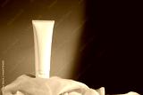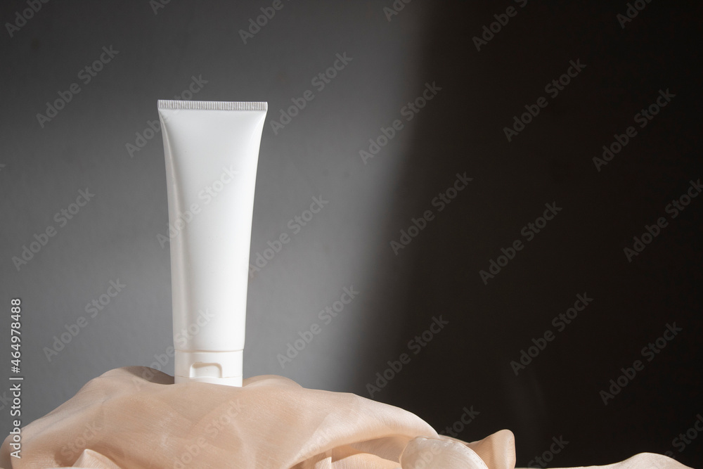 white wood table background with fabric textile, cosmetic makeup bottle lotion cream product with beauty fashion skincare healthcare mockup