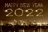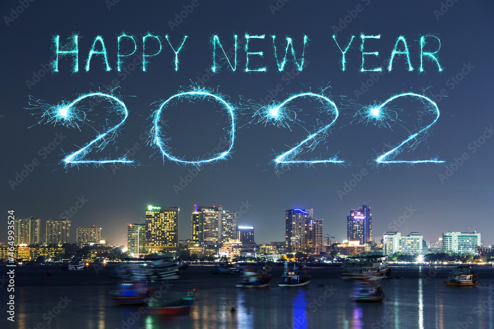 2022 Happy new year firework Sparkle over Pattaya cityscape at night, Thailand