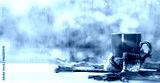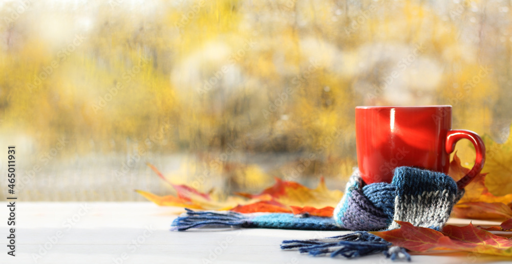 maple leaves and a red mug wrapped in a blue scarf on a table against the background of a window. warm moments of autumn