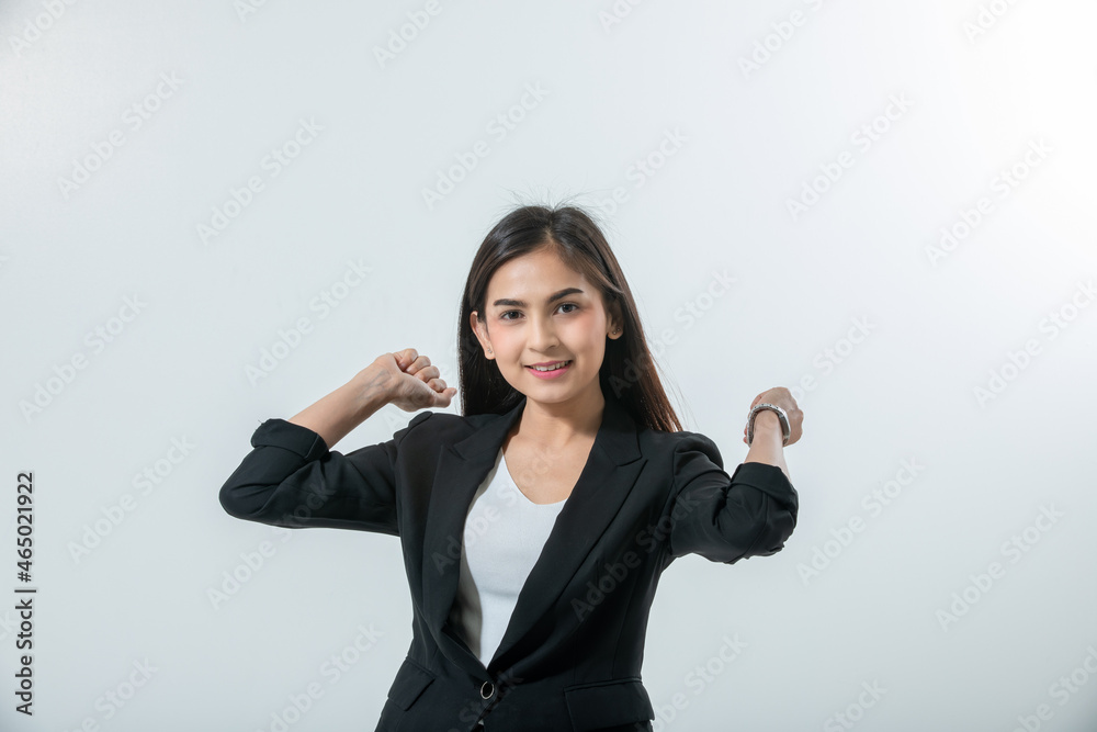 Happy Asian businesswomen Success and winning concept - happy team with raised up hands celebrating the breakthrough and achievements for working on white background